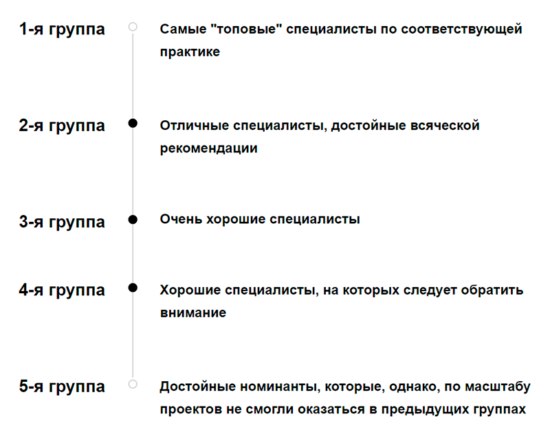 Рейтинг именной, не привязанный к месту нахождения конкретного специалиста. Для каждого номинанта указано имя, фамилия, компания, в которой он работал на момент проведения исследования, а также позиция в ней (партнер, советник, юрист